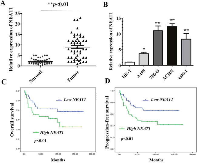 Figure 1: Relative NEAT1 expression in RCC tissue and cell lines, and its clinical significance. (A) Relative expression of NEAT1 expression in RCC (n = 102) and paired normal (n =102) tissue samples. NEAT1 expression was analyzed by qRT-PCR and normalized to GAPDH expression. Statistically significant differences between samples were identified using paired t-tests (n = 102, ** p < 0.01). (B) Analysis of NEAT1 expression in four RCC cell lines and HK-2 cells (mean ± SEM).*p < 0.05 and **p < 0.01, respectively. (C and D) Kaplan-Meier curves for overall survival (C) and progression-free survival (D) in RCC patients with low and high NEAT1 expression.