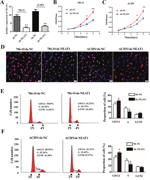 Figure 2: The effects of NEAT1 on RCC cell proliferation and cell cycle progression. (A) The efficiency of NEAT1 silencing in RCC cell lines measured by qRT-PCR. (B and C) Representative results of CCK-8 cell proliferation assays. (D) Representative photomicrographs of EdU staining in 786-O and AHCN cells after transfection with shNEAT1. The click-iT reaction revealed EdU staining (red). Cell nuclei are stained with DAPI. (E and F) Analysis of cell cycle progression in RCC cells (786-O and AHCN) following NEAT1 knockdown. Peak diagram (left) and distribution of cells in the G0/G1, S, and G2/M phases of the cell cycle (right).*p < 0.05 and **p < 0.01, respectively, compared to controls.