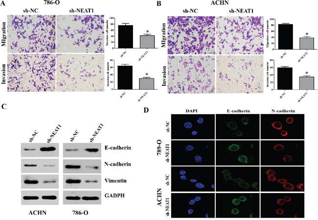 Next, we investigated the effects of NEAT1 on RCC cell migration and invasion. NEAT1 knockdown suppressed 786-O and ACHN cell migration and invasion (Figure 3A and 3B, p < 0.05). Because EMT is a critical event in metastasis [17], we investigated whether NEAT1 knockdown could reverse the EMT phenotype in RCC cells. Western blot analysis indicated that knockdown of NEAT1 in 786-O and ACHN cells resulted in down-regulation of N-cadherin and vimentin expression, and up-regulation of E-cadherin (Figure 3C). Immunofluorescence assays also confirmed that down-regulation of NEAT1 resulted in an increase in the epithelial marker and a decrease in the two mesenchymal markers in 786-O and ACHN cells (Figure 3D). Thus, down-regulation of NEAT1 inhibits RCC cell migration and invasion by suppressing EMT.
