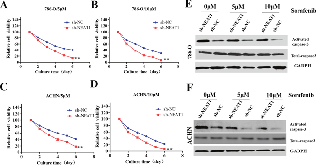 Figure 4: Role of NEAT1 in the sensitivity of RCC cells to sorafenib. (A-D) CCK8 assays of NEAT1-knockdown or control cells incubated with the indicated concentrations of sorafinib. The error bars represent the mean ± SEM of at least three independent experiments. **p < 0.01 compared to controls. (E and F) Western blot of apoptosis-associated proteins (activated and total caspase-3). GAPDH was used as the loading control.