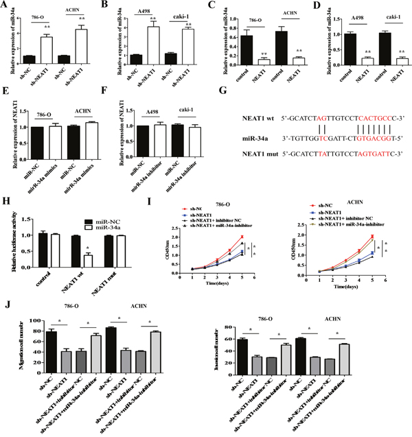 Figure 5: MiR-34a is a target of NEAT1. (A and B) The effects of NEAT1 knockdown on miR-34a levels was measured in RCC cells by qRT-PCR. **p < 0.01 compared to controls. (C and D) Measurement of miR-34a levels by qRT-PCR following over-expression of NEAT1 in RCC cells.**p < 0.01 compared to controls. (E and F) NEAT1 levels measured by qRT-PCR after over-expression or knockdown of miR-34a. (G) Bioinformatics analysis predicts miR-34a binding sites at two distinct positions in NEAT1. (H) Luciferase activity in RCC cells co-transfected with miR-34a mimics or a negative control and luciferase reporters containing no insert (control), NEAT1 wt, or NEAT1 mut. The error bars represent the mean ± SEM of at least three independent experiments. *p < 0.05 and **p < 0.01, respectively, compared to controls. (I) Analysis of the cell proliferation rate after co-transfection of 786-O and ACHN cells with NEAT1 shRNA and miR-34a inhibitors, using CCK-8 assays. *p < 0.05 and **p < 0.01, respectively, compared to controls. (J) MiR-34a inhibition abolishes the effects of the NEAT1 knockdown on the migration and invasion of 786-O and A498 cells. *p < 0.05 and **p < 0.01, respectively, compared to controls.