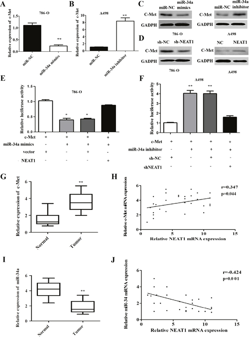 Figure 6: NEAT1 regulates the miR-34a/c-Met axis in RCC. (A) NEAT1 knockdown results in down-regulation of c-Met mRNA in 786-O cells. (B) NEAT1 over-expression results in up-regulation of c-Met mRNA in A498 cells. (C) Western blot analysis of c-Met levels after miR-34a over-expression or knockdown. (D) Effect of aberrant NEAT1 expression on cMET protein levels as measured by Western blotting. (E and F) In the presence of p-NEAT1, c-Met expression was restored compared to controls (E) and reduced c-Met expression after NEAT1 silencing (F). The error bars represent the mean ± SEM of at least three independent experiments. *p < 0.05 and **p < 0.01, respectively, compared to controls. (G and H) The expression of c-Met in 30 paired samples of primary RCC and normal tissue (G), NEAT1 and c-Met expression are positively correlated in 30 RCC tissue samples (r = 0.347, p = 0.044; Figure 6H). (I and J) Analysis of miR-34a expression in 30 paired RCC and normal tissue samples by qRT-PCR (I), NEAT1 and miR-34a expression are negatively correlated in 30 RCC tissue samples (r = -0.424, p = 0.001; Figure 6J).