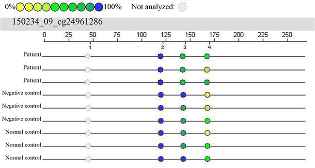 The purified product was applied to a 384 SpectroCHIP chip using a MassARRAY Nanodispenser RS1000 arrayer (SEQUENOM, USA), and the chip was analyzed using the MassARRAY Compact System (SEQUENOM). Matrix-assisted laser desorption/ionization-time of flight-mass spectrometry (MALDI-TOF-MS) was used to analyze the SpectroCHIP chip. The data were analyzed and the results outputted using EpiTYPER software (SEQUENOM, USA).