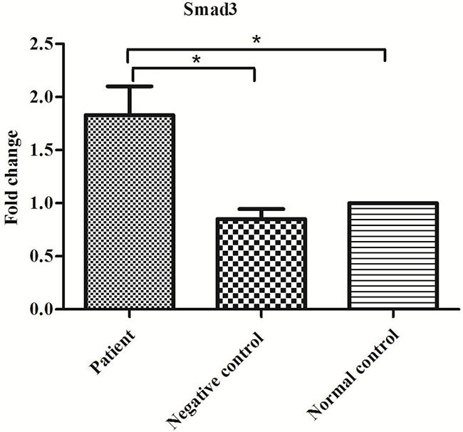 Figure 2: Expression of Smad3 mRNA in the patient, negative control and normal control groups. *P<0.05.