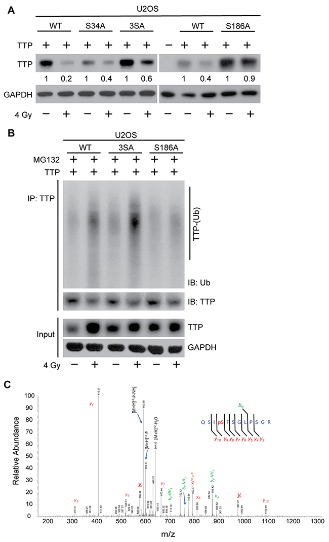 Figure 4: Radiation-induced Ser186 phosphorylation of TTP primes it for polyubiquitination. (A) U2OS cells overexpressing either wild-type (WT) or various serine to alanine mutants [S34A, S34/35/39A (3SA) and S186A] of human TTP, were either sham irradiated or treated with 4 Gy. Twenty-four hours post-irradiation cell lysates were immunoblotted. Changes in total TTP levels were calculated assuming TTP overexpressed untreated control band intensity as 1. (B) U2OS cells overexpressing either WT or various (3SA and S186A) mutants of TTP were either sham-irradiated or treated with 4 Gy. Six hours after irradiation cells were treated with MG132 as above, and 4 h post-MG132 treatment cell lysates were immunoprecipitated using TTP antibody and immunoblotted. (C) Representative MS/MS spectrum identifying serine186 phosphorylation on TTP upon 4 Gy.