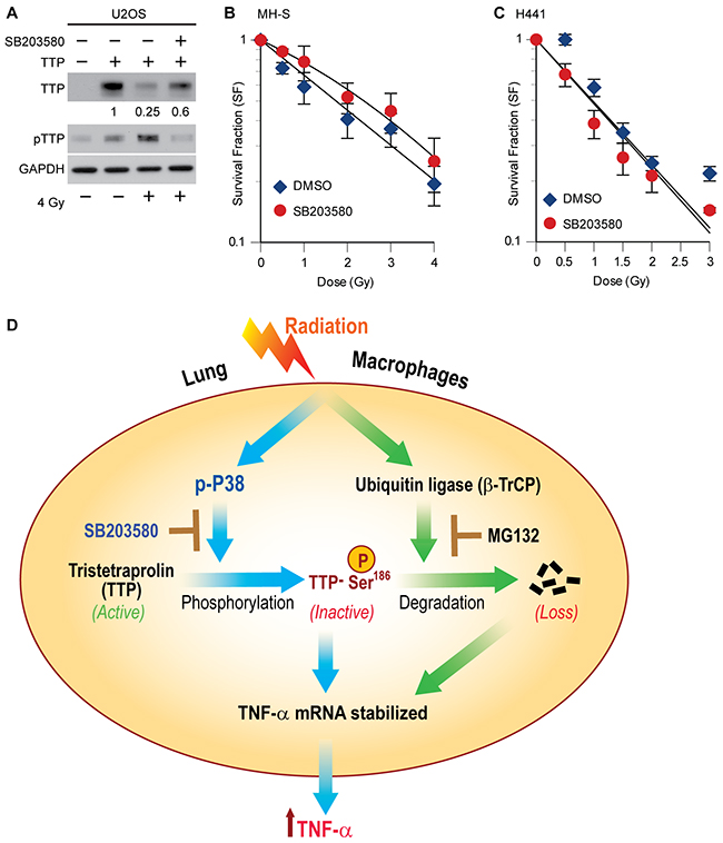 Figure 5: P38 inhibitor (SB203580) blocks radiation-induced TTP degradation and radioprotects lung macrophages. (A) U2OS cells overexpressing human TTP were either treated with DMSO or 1 μM SB203580 thirty minutes prior to 4 Gy. Twenty-four hours after irradiation cell lysates were prepared and immunoblotted. Change in total TTP levels were calculated assuming TTP overexpressed untreated control band intensity as 1. (B, C) Either MH-S cells (in B) or H441 cells (in C) were plated at clonal density and after 24 h treated with 1 μM of SB203580 thirty minutes prior to different doses of radiation. Cells were then left for colony formation as described in materials and methods. (D) Schematic model showing the interconnectedness between p38-mediated phosphorylation and SCFβ-TrCP-mediated degradation in radiation-induced TTP inactivation and further proposing the novel use of the p38 inhibitor as a lung radioprotector. Previously reported observations are shown using solid blue lines, whereas, data shown in the current manuscript are denoted using solid green lines.