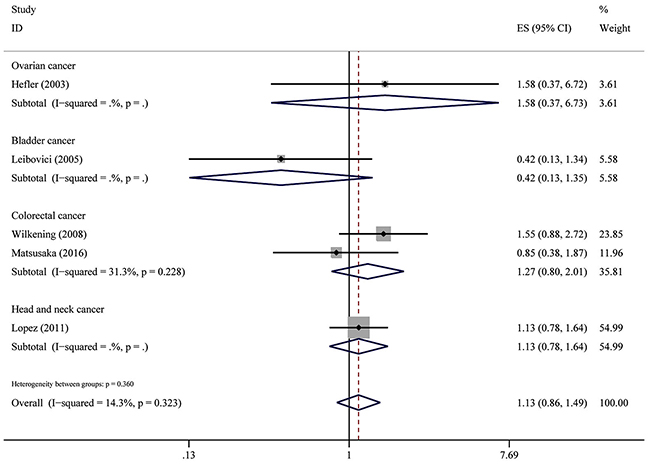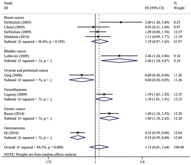 Figure 3: Overall association between IL-6-174G>C polymorphism and OS of cancer (GC/GG). For each study, the estimate of HR and its 95% (CI) is plotted with a box and a horizontal line. The symbol diamond indicates pooled HR and its 95% CI.