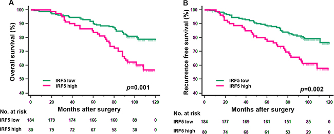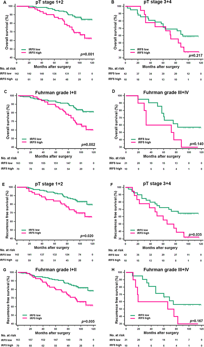 In conclusion, we have revealed that IRF5 expression could serve as an adverse independent prognostic factor in non-metastatic ccRCC. Higher IRF5 expression indicated worse clinical outcomes than the counterparts. Moreover, the prediction model we built in the present study could further stratify the patients with different outcomes. Above all, we have reason to believe that IRF5 might promote ccRCC progression. Limitations of the present study are the retrospective design and only non-metastatic disease are involved. A multicenter and prospective study is needed to validate the results.