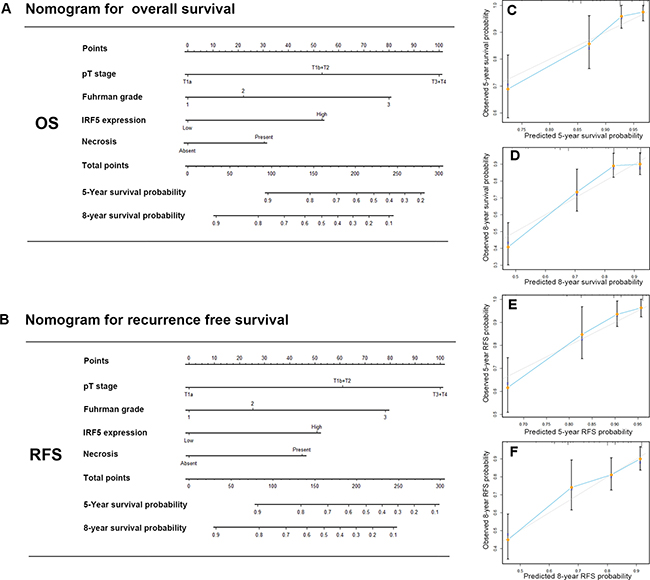 On the basis of results above, we attempted to build a prediction model that incorporating of IRF5 expression and other prognostic parameters to give a better stratification of clinical outcomes. The prognostic parameters include T stage, Fuhrman grade and presence of necrosis. We constructed two nomograms to predict OS and RFS at 5 and 8 years after surgery (Figure 4A, 4B). Higher total point indicated worse outcome. The calibration plots of the nomograms were shown for OS (Figure 4C, 4D) and RFS (Figure 4E, 4F). The Harrell’s c-indices for OS and RFS were 0.78 (95% CI, 0.72–0.83) and 0.77 (95% CI, 0.71–0.83) respectively, higher than the combination of other prediction factors except IRF5, 0.72 (95% CI, 0.66–0.78) for OS and 0.70 (95% CI: 0.64–0.76) for RFS. So we believed that the newly constructed model could give a better prediction for OS and RFS.