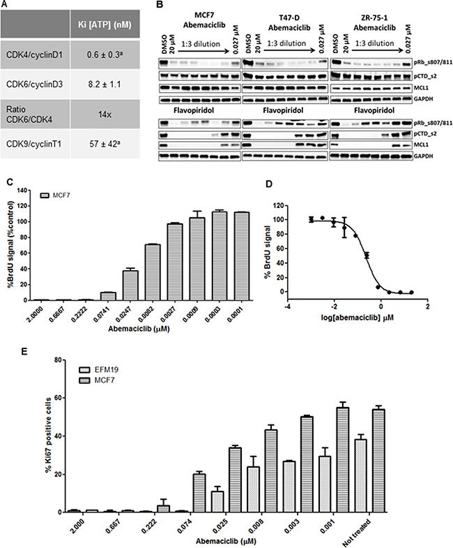 Figure 1: Enzymatic selectivity of abemaciclib and effect on cell proliferation. aValues originally published [16]. (A) Kinetic parameters (KiATP) and selectivity ratio of abemaciclib for cyclinD1/CDK4 and cyclinD3/CDK6 complexes in vitro. Data reported as average of two independent determinations (n = 2) ± standard deviation (SD) (B) ZR-75-1, T-47D and MCF7 cells were treated for 24 hours with DMSO vehicle or with 3-fold dilutions of either abemaciclib or flavopiridol starting at 20 μM and ending at 27 nM. Protein lysates were prepared from the cells and analyzed for the expression of various biomarkers by immunoblotting. The biomarkers included phosphor-Rb at serines 807/811, phosphorylation of serine 2 on the C-terminal repeat domain on RNA polymerase II (pCTD) and MCL1. Images of Western blots were cropped to denote the relevant band(s) for clarity. (C, D) MCF7 cells were incubated for 3DT with abemaciclib at the concentrations indicated in (C). % BrdU signal was normalized using a PI3K/mTOR inhibitor (BEZ235) as a positive control for inhibiton of cell proliferation and 0.2% DMSO as a negative control (C) and the corresponding IC50 curve is shown in (D). (E) Ki-67 expression level in MCF7 and EFM-19 cells upon abemaciclib treatment at the indicated concentrations for 2DT. Ki-67 positive events were obtained by gating versus background signal. The percentage of Ki-67 positive cells was calculated among the total number of cells and is expressed as mean (n = 2 for samples treated with abemaciclib, n = 4 for untreated samples).