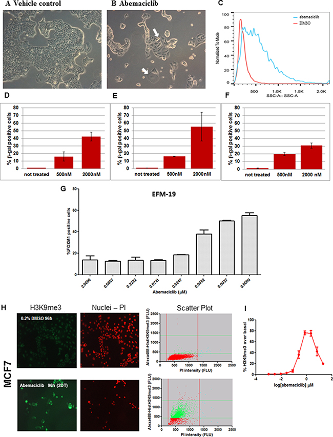Figure 3: ER+ breast cancer cell lines treated with abemaciclib showed morphological changes, increased β-gal expression and chromatin changes consistent with senescence. (A, B) MCF7 cells were treated with DMSO 0.2% (A) or 0.5 μM abemaciclib (B) for 3DT and images were taken at 100x by bright field microscopy (Leica DMiL). White arrows indicate evident morphological changes enlarged and flatten cytoplasm upon treatment with abemaciclib. (C) MCF7 cells were treated with either DMSO (red line) or 0.5 μM of abemaciclib (blue line) for 3 DT and side scatter (SSC) analysis was carried out using flow cytometry and analyzed with FlowJo X software. (D–F) MCF7 cells were treated with abemaciclib for 2 days (D), 7days (E), or 10 days (F) and β-gal was measured by high-content imaging (HCI). For abemaciclib treated samples (n =2), and for untreated cells (n = 6), the means (SD) are plotted. (G) EFM-19 cells were treated for 1DT with abemaciclib at the indicated concentrations. FOXM1 positive cells were detected by HCI; signal for % FOXM1-positive cells is expressed as mean (SD) (n = 2 for abemaciclib treated samples and n = 4 for untreated samples). (H) MCF7 cells were treated with DMSO or 0.5 μM abemaciclib for 2DT and immunofluorescence was carried out with an H3K9me3 antibody and PI. Microscopy images are shown on the left and scatter plots of total and H3K9me3 positive cell populations are represented on the right (Red = nuclei; green = H3K9me3 positive cells). (I) MCF7 cells were treated for 2 DT with different concentrations of abemaciclib. The % of H3K9me3 positive cells was obtained by normalizing versus a control population and expressed as the number of objects stained with H3K9me3 antibody; the mean (SD) of 2 independent experiments at each concentration is plotted.