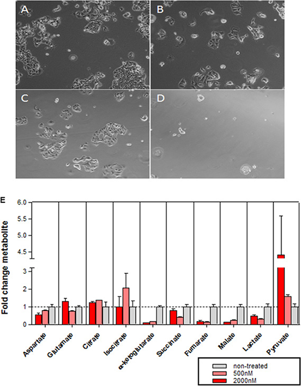 Figure 6: Effects of abemaciclib on cellular metabolism. (A–D) Glutamine-dependence of MCF7 cell growth. Microscopy images of MCF7 cells grown for 2.5DT in complete DMEM with DMSO 0.2% (A), complete DMEM with abemaciclib 0.5μM (B), glutamine starvation medium with DMSO 0.2% (C), or glutamine starvation medium + abemaciclib 0.5μM (D). (E) Metabolic profile in MCF7 cells after 3DT of treatment with abemaciclib at 500 nM and 2000 nM. The mean of duplicate assays is shown (+/- SD) for a representative experiment; the experiment was repeated on 4 separate occasions.