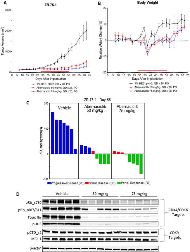 Figure 7: Abemaciclib monotherapy induces regression of ER+ breast cancer xenografts. (A) NOD SCID mice (n = 8/group) implanted with ZR-75-1 xenograft tumors were treated by oral gavage (PO) once-daily for 28 days (QDx28) with 50 or 75 mg/kg of abemaciclib mesylate beginning on day 28 after tumor implantation. Control animals were treated with vehicle (1% HEC/ 25 mM phosphate buffer, pH = 2) using the same schedule of dosing. The red bar just above the X-axis illustrates the duration of the treatment period. Tumor volume measurements were taken routinely during the course of the study and are plotted as mean +/- SEM versus days following tumor cell implantation. (B) Body weights were recorded routinely during the course of the study and are plotted as mean % change (+/– SEM) relative to the mean body weight recorded on the day just prior to the first day of dosing (baseline day = 27). (C) The waterfall plots indicate the relative tumor volumes for individual animals which were determined at the end of the dosing period (study day 55). The text at the top of each panel of bars provides a description of each of the treatment groups. Growth inhibition is observed in those instances where the calculated changes in %DT/C are less than 100% whereby greater inhibition results in smaller %DT/C values. Change in %DT/C values that are less than zero indicate regressions whereby the tumor volumes on day 55 are smaller than the baseline tumor volume measured on the day prior to the initiation of dosing (baseline day = day 27). The bars for the individual animals are colored on the basis of overall response such that the blue bars indicate progressive disease (PD), the red bars indicate stable disease (SD), and the green bars indicate a partial response (PR). The tumor volumes measured on day 27 served as the baseline volumes for the calculation of %DT/C. Note that one animal in the vehicle control group was sacrificed prior to day 55 due to tumor growth that exceeded the ethical size limits. (D) Mice (n = 5/group) implanted with ZR-75-1 xenograft tumors were treated once-daily for 5 days (QD x 5) with vehicle or 50 or 75 mg/kg of abemaciclib beginning on Day 27 after tumor implantation. The xenograft tumors were collected 24 hours later and analyzed by immunoblotting for inhibition of CDK4/CDK6 by assessing the inhibition of phosphorylated Rb (pRb) at serine sites 780 (ser780) or 807/811 (ser807/811), Topo IIα, and phosphorylated histone H3 (pHH3) at serine 10 (ser10). Potential CDK9 inhibition was assessed by measuring the expression of MCL1 or phosphorylation of serine 2 on the C-terminal domain repeat on RNA polymerase II (pCTD). Images of Western blots were cropped to denote the relevant band(s) for clarity; β-actin was used as a loading control.