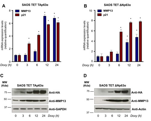Figure 1: p63 upregulates mRNA and protein levels of MMP13. (a,b) mRNA expression of MMP13 was induced by both p63 isoforms in a time-dependent manner. Levels of MMP13 and of the previously described p63 target gene, p21, were evaluated by real time qPCR following the TAp63α (a) and ΔNp63α (b) induction after 3, 6, 12, 24 hours (h) of 4μg/ml doxycycline (Doxy) treatment in SaOs-2 inducible cells. Relative expression of MMP13 and p21 was normalized using the housekeeping gene, TBP, and calculated as fold induction. Data represent mean ± SD of three different experiments. *, p < 0.01 (c,d) MMP13 protein induced by TAp63α (c) and ΔNp63α (d) at the same time indicated for qPCR. Western blot analysis was performed using the indicated antibodies. GAPDH or Actin were evaluated as control. The experiment is representative of three independent experiments.