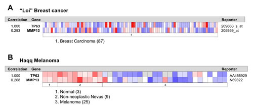 Figure 3: p63 and MMP13 expression directly correlates in human breast and melanoma cancers. (a,b) Expression data from Oncomine website (www.oncomine.org). We used the following filters: gene ‘TP63’; Analysis Type: ‘Coexpression analysis’; Cancer Type: Breast (a) or Melanoma Cancer (b). The colour changes according to a weaker (blue) or higher (red) expression, passing by white, with fluctuating colour intensity. The reporters indicate probes used for the analysis.