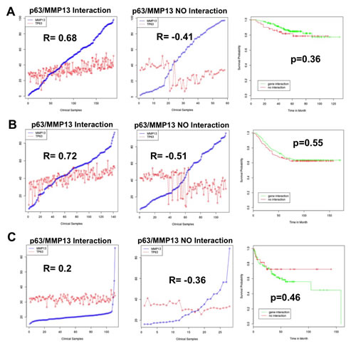 To confirm the existence and to assess the relevance of p63/MMP13 axis, we searched for expression correlation of these two genes in human cancer patient datasets. Breast cancer represents a heterogeneous group of diseases with different biological and morphological features, although strong efforts have been placed in identification of biomarkers of high-grade/metastatic forms of this disease[90-92], still much is expected to improve prognostic and predictive marker assessment. Melanoma is among the most aggressive cancer, with high incidence of metastasis and advanced stages progression [93-96]. Therefore to confirm p63/MMP13 relevance in cancer, we selected two cancer datasets: a breast carcinoma cohort [97] of 87 samples and a melanoma cohort, which included 25 melanomas [98], 9 non-neoplastic nevus and 3 normal samples. Coexpression analysis showed direct association between p63 and MMP13 mRNA level in both the datasets analysed. The breast cancer dataset presented a correlation factor of 0.293, while the melanoma dataset of 0.298 (Fig. 3A,B). These data confirm a coexpression and a direct correlation of p63 and MMP13 in human cancers. The melanoma dataset included normal and non-neoplastic specimens. Interestingly, a clear switch from high p63/MMP13 expression to low p63/MMP13 occurred in the transition towards the malignant state of melanocytes (Fig. 3B). To further investigate the function of p63/MMP13 in cancer, we decided to analysed MMP13 ability to function as prognostic factor of human cancer. We used three different publicly available datasets of human cancer, which included patient survival information (lung adenocarcinoma GSE31210, breast cancer GSE2034, and liposarcoma GSE30929). Patient datasets were clustered according to the expression of MMP13 (high expressing, low expressing). Kaplan-Mayer curve for survival estimation showed that a high MMP13 expression was predictive of poor survival (Fig. 4A-C), suggesting that MMP13 plays an important role in cancer aggressiveness. In order to elucidate whether p63 functions as a controller of MMP13 expression in cancer, we evaluated the biological consequence of p63/MMP13 coexpression in cancer patients. We selected the datasets analyzed in figure 4 (lung adenocarcinoma GSE31210, breast cancer GSE2034, and liposarcoma GSE30929) and we split the samples in two cohorts. The first cohort included all the samples to maximize positive correlation between p63 and MMP13, while in the second cohort all the other samples were included (Fig. 5). Thus, we clustered the dataset in two biological groups: one where p63/MMP13 axis was present (p63/MMP13 interaction), and second in which it was absent (p63/MMP13 NO interaction). Performing Kaplan-Mayer survival estimation the two cohorts did not show any significant difference in the survival expectation (Fig. 5). These data suggest that, although p63 is able to control MMP13 expression, it is very unlikely this axis plays any relevant role in cancer biology.