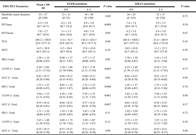 In the present study, we found that patients that were categorized as complete never-smoker predicted the presence of the EGFR mutation and current and former smoker predicted the presence of KRAS mutation. The SUVmax of FDG uptake in lung lesion were also significant parameters, while those of MTV and TLG were not significant. Of several parameters regarding tumor heterogeneity, 1/COV was the only significant factor which was not dependent on metabolic tumor diameter. The multivariate analysis showed never-smoker smoking status was the only significant factor for EGFR mutation, and that current and former smoker status was the only significant factor for KRAS mutation in lung cancer.