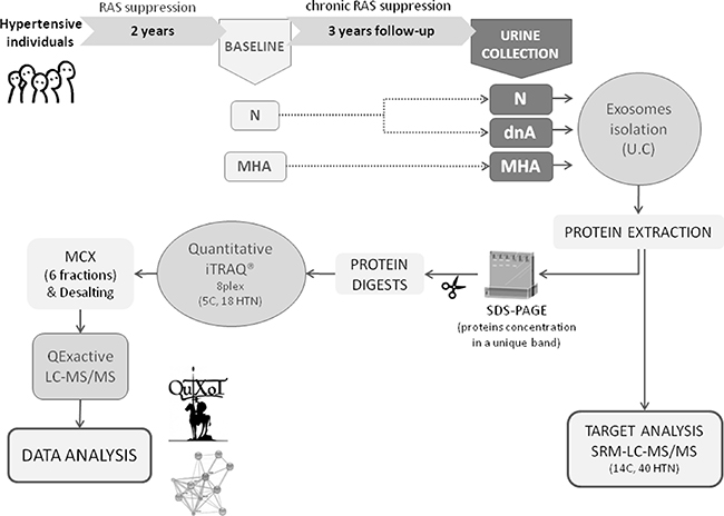 Figure 5: Schematic representation of the study workflow. Urine samples from 40 non-diabetic hypertensive patients and 16 healthy controls were collected. In iTRAQ experiment 5 control samples and 18 patients, 6 of each group, were included (6 N, 6 dnA and 6 MHA). By SRM, samples from the 40 hypertensives and from 14 healthy controls were analyzed individually. C: control, N: normoalbuminuria, dnA: de novo albuminuria, MHA: maintained albuminuria, UC: ultracentrifugation, SRM: selected reaction monitoring, MCX: mixed-cation exchange, HTN: hypertension.
