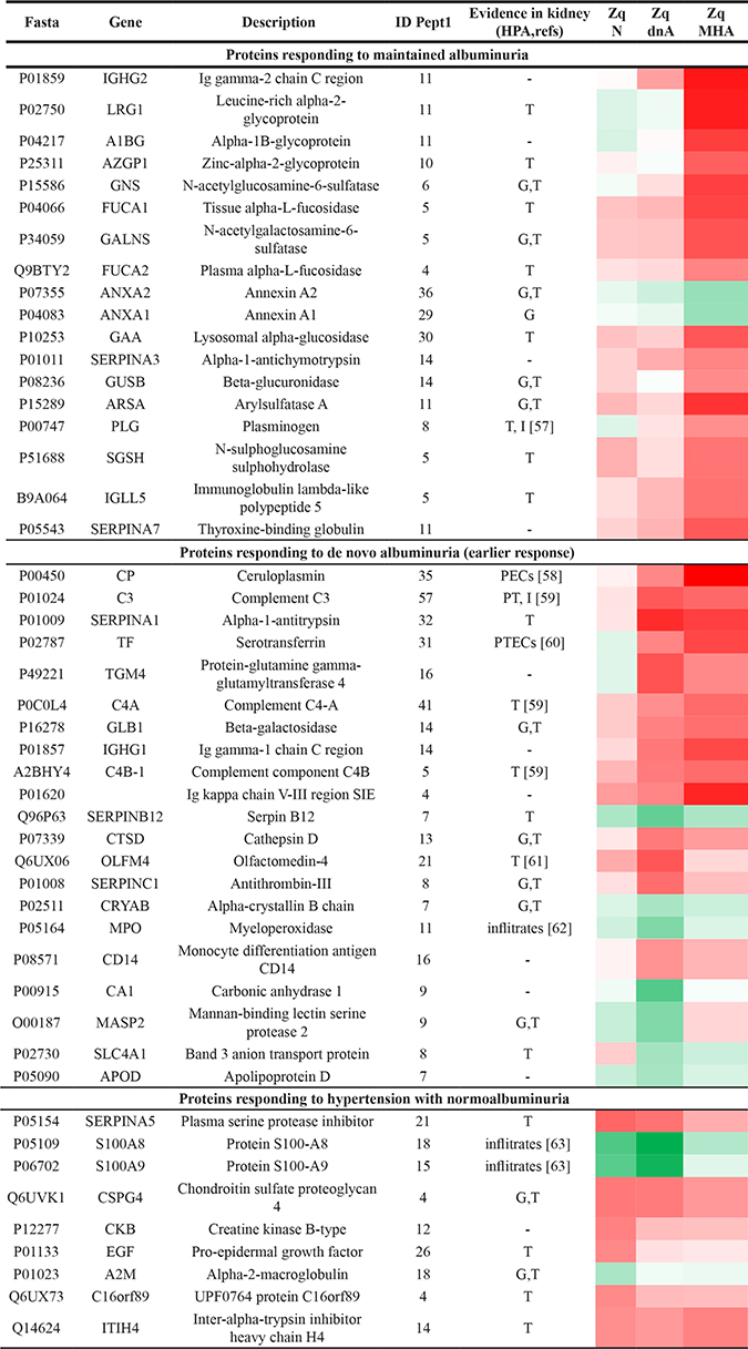 Proteins whose levels were identified to be altered were those with a significance cut off value of Zq ≥ 1.4 (absolute value) versus the control group, and showing intra-group consistency of variation between the two biological replicates analyzed per group. With these criteria, iTRAQ quantitative analysis revealed 48 proteins (out of the 487 identified) showing altered levels in hypertensive patients under chronic RAS suppression as compared with healthy subjects (Table 1). The magnitude of protein alteration in Table 1 is represented by a heat map (red, up-regulation; green, down-regulation versus the control group). Three main trends could be observed, being up- or down-regulated in response to: hypertension without albuminuria (9 proteins), maintained albuminuria (18 proteins), and de novo albuminuria (21 proteins). According to the Human Protein Atlas, 56% of the identified proteins have annotated expression in the kidney, mainly in the tubule (26 proteins) but also in the glomerulus (13 proteins). The majority of these proteins were also identified in a recent study characterizing the proteome of urinary exosomes specifically released by podocytes [15].