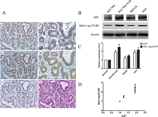 Figure 1: Expression pattern of PrPC and MGr1-Ag/37LRP protein in gastric cancer tissue and cell lines. (A) Results from immunohistochemical staining of MGr1-Ag/37LRP and PrPC in gastric cancer tissue serial sections. Upper row: expression pattern of MGr1-Ag/37LRP in gastric cancer tissue (a 200×, b 400×); middle row: expression pattern of PrPC in gastric cancer tissue (c 200×, d 400×); lower row: negative control (e 200×) and HE staining (f 200×). (B–D) Western blot analysis of PrPC and MGr1-Ag/37LRP protein expression level in gastric cell lines SGC7901, SGC7901/VCR, MKN28 and AGS, β-actin was used as internal control.