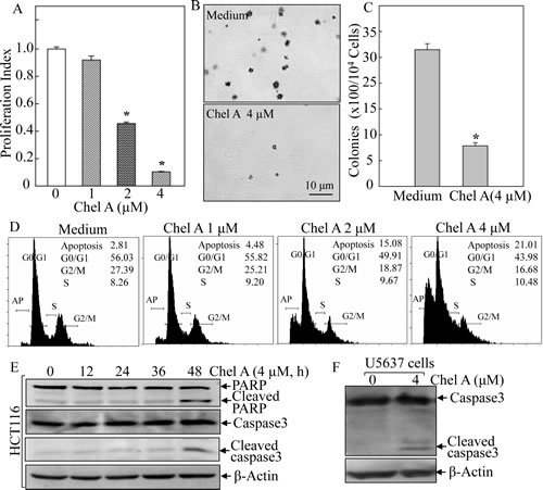 Fig 1: Chel A inhibited cell viability and anchorage-independent growth via induction of apoptosis in human colon cancer HCT116 cells. (A) HCT116 cells were treated with Chel A for cell proliferation assay as described in “Material and Methods”. After treated for 48 h, cell proliferation was measured by using Cell Titer-GloLuminescent Cell Viability Assay kit. The results are expressed as relative luminescence signal to medium control (proliferation index). Each bar indicates the mean and SD of triplicate assays. The symbol (*) indicates a significant decrease as compared with that of medium control (P<0.05). (B&C) HCT116 cells were exposed to indicate concentrations of Chel A in soft agar as described in Material and Methods. After being cultured in 37oC with 5% CO2 for 3 weeks, the colony formation was observed under inverted microscope and photographed (B). The number of colonies was scored, and presented as colonies per 104 seeded cells (C). The symbol (*) indicates a significant decrease as compared with that of vehicle control (P <0.05). Each bar indicates the mean and SD from three independent experiments. (D-F) HCT116 cells (D & E) or U5637 cells (F) were cultured in each well of a six-well plate with McCoy’s 5A medium containing 10% FBS at 37°C overnight. After synchronization of cells by culturing in McCoy’s 5A medium containing 0.1% FBS for 24 hours, the cells were treated with various concentrations Chel A as indicated, for 48 hours (D) or with 4.0 µM Chel A for indicated time periods (E) or for 36 hrs (F). The cells as indiacted were collected and subjected to flow cytometry assay (D) and Western blot assay (E & F). The result was representative one from three independent experiments.
