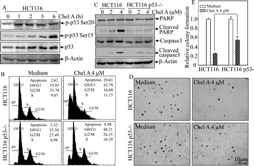 Fig 2: p53 induction mediated Chel A-induced apoptosis. (A) HCT116 cells were treated with Chel A for indicated time periods and cell extracts were subjected to Western blotting for the detection of phosphorylated and total p53 protein expression. β-Actin was used as a control for protein loading. (B&C) HCT116 p53+/+ and p53-/- cells were seeded into six-well plates. The cells were treated with Chel A for 48 hrs and then subjected to flow cytometry assay (B) or treated with Chel A for 48 hrs and then subjected to Western blotting to determine the expression and cleavages of PARP and Caspase 3. β-Actin was used as a control for protein loading (C). The result showing was a representative one from three independent experiments. (D&E) HCT116 p53+/+ and p53-/- cells were exposed to indicate concentrations of Chel A in soft agar as described in Material and Methods. After being cultured in 37℃ with 5% CO2 for 3 weeks, the colony formation was observed under inverted microscope and photographed (D). The relative colony formation was presented as the colony in Chel A-treated group relative to the vehicle control in HCT116 p53+/+ and p53-/- cells, respectively (E). The symbol (*) indicates a significant increase in HCT116 p53-/- cells with treatment of Chel A as compared with that in HCT116 p53+/+ cells treated with Chel A (p <0.05). Each bar indicates the mean±SD of three independent experiments.