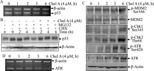 Fig 3: p53 protein induction by Chel A was via the inhibition of p53 protein degradation. (A) HCT116 cells were treated with Chel A for indicated time periods, and p53 mRNA was measured by RT-PCR. (B) HCT116 cells were pretreated with MG132 for 4 hrs, followed by exposure with CHX combined with Chel A or CHX alone as indicated. Then cell extracts were subjected to Western Blotting and β-Actin protein expression was used as a protein loading control. (C) HCT116 cells were exposed to Chel A for indicated time periods, and cell extracts were subjected to Western Blotting and β-Actin protein expression was used as a protein loading control. (D) HCT116 cells were treated with Chel A for indicated time periods, and ATR mRNA was evaluated by RT-PCR.