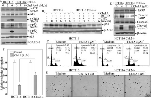 Chk2 knockout attenuated p53 activation, cell apoptosis, and the inhibition of colony formation by Chel A in HCT116 cells