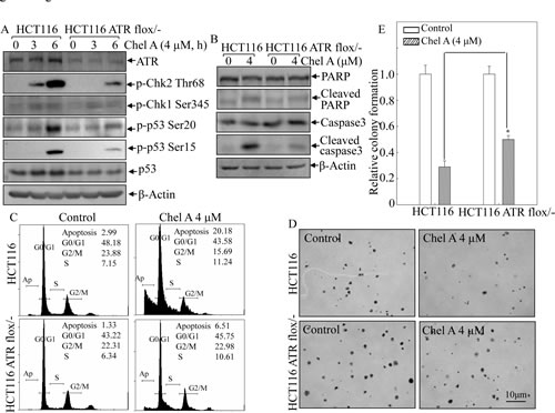flox/- cells and its parental wild type cells were treated with Chel A as indicated, and the cell extracts were subjected to Western blotting for determination of the protein expressions using specific antibosies. β-Actin was used as protein loading controls. (B&C) HCT116 ATR flox/- and wild type cells were were treated with Chel A for 48 hrs. The cells were then collected and subjected to flow cytometry analysis (B), or subjected to Western blotting(C). The result showing was a representative one from three independent experiments. (D&E), HCT116 ATR flox/- and its parental wild type cells were exposed to indicated concentrations of Chel A in soft agar. After being cultured in 37oC with 5% CO2 for 3 weeks, the colony formation was observed under inverted microscope and photographed (D). The relative colony formation was presented as the colony in Chel A-treated group relative to the vehicle control in HCT116 ATR+/+ and ATR flox/- cells, respectively (E). The symbol (*) indicates a significant increase in HCT116 ATR flox/- cells with Chel A treatment as compared with that in HCT116 cells treated with Chel A (P<0.05). Each bar indicates the mean±SD of three independent experiments.