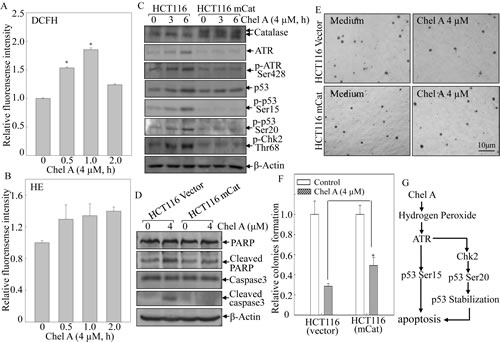 Fig 6: mCat overexpression blocked the biological effect of Chel A-induced hydrogen peroxide in HCT116 cells. (A&B) HCT116 cells were pretreated with 2’,7’-dichlorfluorescein-diacetate (DCFH) (A) ordihydroethidium (HE) (B), respectively, for 0.5 hr, followed by being treated with Chel A for indicated time periods. Then cells were washed with PBS, and subjected to fluorescence intensity detection. The results were shown as the induction of each time point relative to 0 h(Relative fluorescence intensity). The symbol (*) indicates a significant increase as compared with that at 0 h (P <0.05). Each bar indicates the mean±SD from three independent experiments. (C&D) HCT116 mCat and its parental HCT116 (vector) cells were treated with Chel A for 0-6 hrs, and the cell extracts were subjected to Western blotting. β-Actin was used as protein loading controls. (E&F) HCT116 mCat and HCT116 (vector) cells were treated with indicated concentrations of Chel A in soft agar. After being cultured in 37oC with 5% CO2 for 3 weeks, the colony formation was observed under inverted microscope and photographed (E). The relative colony formation was presented as the colony in Chel A-treated group compared with vehicle control in HCT116 mCat and HCT116 (vector) cells, respectively (F). The symbol (*) indicates a significant increase in HCT116 mCat cells treated with Chel A as compared with that of HCT116 (vector) cells treated with Chel A (p <0.05). Each bar indicates the mean±SD of three independent experiments. (G)The diagram indicates mechanisms responsible for Chel A-induced apoptosis in HCT116 cells.