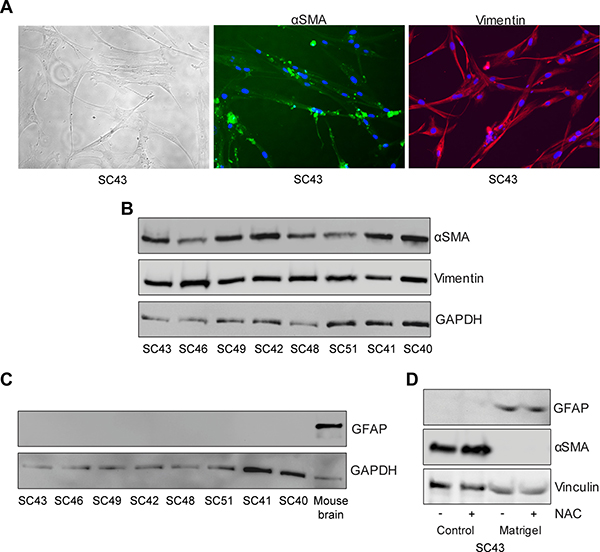 Figure 1: Phenotypic characterization of human pancreatic stellate cells. (A) Pancreatic stellate cells were immunostained with anti-αSMA (green) and anti-Vimentin (red) antibodies. The stellate cells were lysed and proteins subjected to immunoblotting using (B) anti-αSMA, anti-Vimentin and (C) anti-GFAP antibodies. Mouse brain was used as a positive control for GFAP and anti-GAPDH was used as a loading control. (D) De-activation of pancreatic stellate cells was conducted by culturing the cells for six days in normal tissue culturing plates or on matrigel, with or without the addition of N-acetylcysteine (NAC). Thereafter, lysates from the cells were immunostained with anti-GFAP, anti-αSMA and anti-Vinculin (loading control) antibodies.