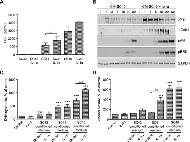 We previously demonstrated that IL-1α increases the ability of pancreatic stellate cells to enhance migration of pancreatic cancer cells [20]. In the present work we aimed to further investigate this effect of IL-1α. Figure 7A shows that IL-1α increased HGF secretion both in the high HGF-producing cells (SC40) and intermediate HGF-producing cells (SC41), but not in the low-producing cells (SC42). Phosphorylation of Met and the downstream signaling molecules Gab1, Akt and ERK was increased when BxPC-3 cells were stimulated by conditioned medium from IL-1α-stimulated SC40 PSCs (Figure 7B), suggesting a functional HGF response to IL-1α. Furthermore, IL-1α-stimulated SC40-conditioned medium enhanced DNA synthesis in BxPC-3 cells whereas no such effect was detected by stimulation with conditioned medium from SC42 or SC41 cells (Figure 7C). IL-1α alone did not affect DNA synthesis or cell migration of BxPC-3 cells (Figure 7C and 7D). However, IL-1α enhanced SC41-stimulated migration in the BxPC-3 cells. No further stimulation could be elicited by IL-1α treatment of the SC40 cells (Figure 7D), suggesting that maximal HGF-induced migration was reached in these cells even in the absence of IL-1α.