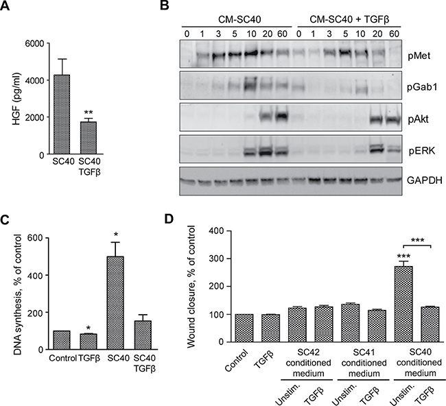 Figure 8: TGFβ-stimulated PSCs reduces HGF secretion and enhance cancer cell migration and DNA synthesis. (A) HGF secretion was measured by ELISA in conditioned medium from the pancreatic stellate cells SC40, incubated in the presence or absence of TGFβ (2 ng/ml). The results are normalized to unstimulated controls. (B) BxPC-3 cells were stimulated for the indicated time points with conditioned medium from the PSCs (SC40) cultured in the presence or absence of TGFβ (2 ng/ml). The cells were lysed and proteins subjected to immunoblotting using the indicated antibodies. Immunoblots shown are representative of three independent experiments. (C) DNA synthesis was determined by measuring [3H]-thymidine incorporation in BxPC-3 cells stimulated with TGFβ (2 ng/ml) or conditioned medium from the pancreatic stellate cells SC40, incubated in the presence or absence of TGFβ (2 ng/ml). TGFβ and PSC conditioned medium were added at 48 h, [3H]-thymidine after 68 h and the cells were harvested at 72 h. (D) Cancer cell migration was determined by wound assay after 10 h stimulation of BxPC-3 cells with TGFβ or conditioned medium from the pancreatic stellate cells SC42, SC41 and SC40, incubated in the presence or absence of TGFβ (2 ng/ml). The wound area was measured at 0 and 10 h and normalized to controls. Error bars represent S.E.M.; *p < 0.05, **p < 0.005, ***p < 0.001.