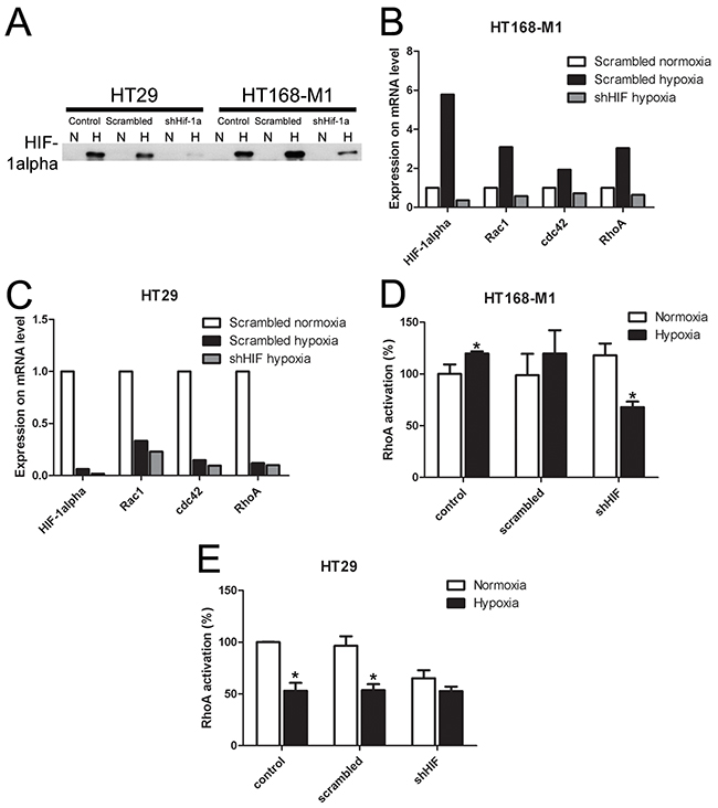 Figure 4: Effect of HIF-1α gene silencing on protein and mRNA expression and RhoA activation. (A) HIF-1α protein expression in HIF-1α-silenced HT168-M1 cell lines. N: normoxic, H: hypoxic (1% O2) conditions. (B-C) Relative mRNA expression under hypoxic conditions compared to normoxic scramble-transfected human tumor cells (normoxic values=1, representative figures). (D-E) RhoA activation in control, scramble-treated and HIF-1α silenced tumor cells under hypoxic (1% O2) conditions. Data are mean ± SD, n=3, *p<0.05.