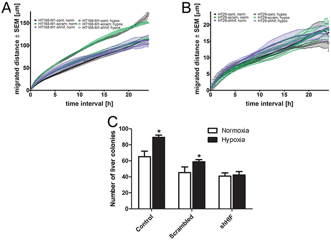 Figure 5: Effect of HIF-1α gene silencing on the migration and in vivo metastatic potential. (A-B), Baseline motility of HT168-M1 and HT29 tumor cell lines measured under normoxic (24 h) and hypoxic (1% O2) conditions for 72 h using time-lapse videomicroscopy. Curves represent the mean ± SD of migrated distance during the test period. (C), HIF-1α silenced HT168-M1 cells were injected intrasplenically and liver colonies formed were counted at day 34 of the treatment. Hypoxia means CoCl2 treatment. Data represent mean ± SEM, *p<0.05.
