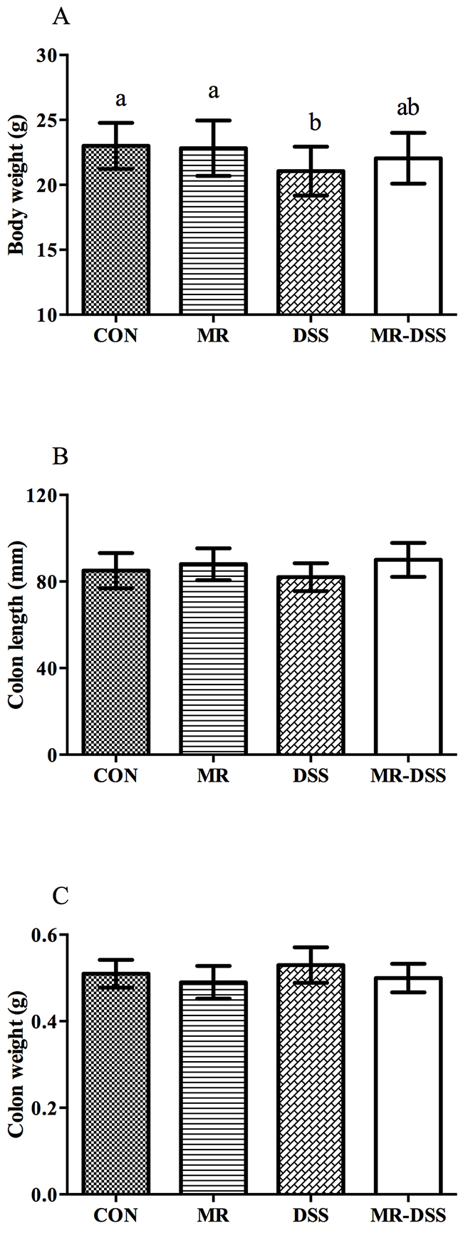 Figure 1: The effect of administration of an MR diet after DSS treatment on (A) body weight, (B) colon length and (C) colon weight. Data are presented as the mean ± SEM. Values with different superscript letters were significantly different (P < 0.05; n = 12).