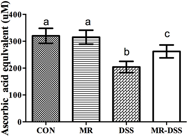 The 2,2′-azino-bis(3-ethylbenz-thiazoline-6-sulfonic acid) (ABTS) array was used to determine the antioxidant capacity in plasma. Figure 3 shows the impact of the administration of an MR diet on the plasma antioxidant power. There was a decrease in the DSS and MR-DSS groups compared with the MR and control groups (P< 0.05). There was a significantly increased total antioxidant capacity in the MR-DSS group compared to the DSS group (P< 0.05), but no significant difference between the MR group compared to the CON group.