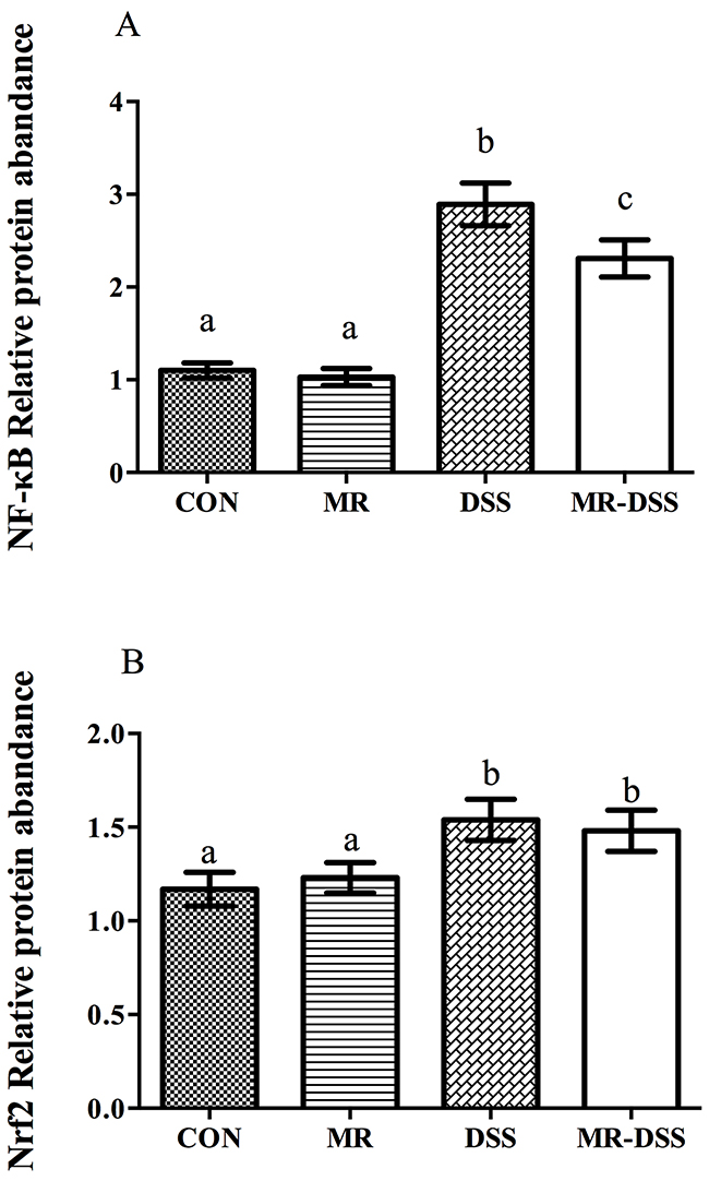 Measurements of nuclear NF-κB (p65) were performed to evaluate NF-κB activation in the colons of the mice. Treatment with DSS resulted in a significantly activated nuclear NF-κB signal (P < 0.05), as shown in Figure 5A. No significant difference in nuclear NF-κB (p65) was seen between MR mice and the CON group. In the MR-DSS group, the activation was significantly suppressed by the MR diet although there was a significantly lower quantity of nuclear NF-κB in the MR mice than in the MR-DSS group (P < 0.05). For the Nrf2/Keap1 signaling pathway, the MR diet had no impact on the Nrf2 signal compared to the control group as shown in Figure 5B, but there was clear enhancement of the colonic nuclear Nrf2 abundance resulting from DSS and MR-DSS groups compared to the control and MR groups (P < 0.05).