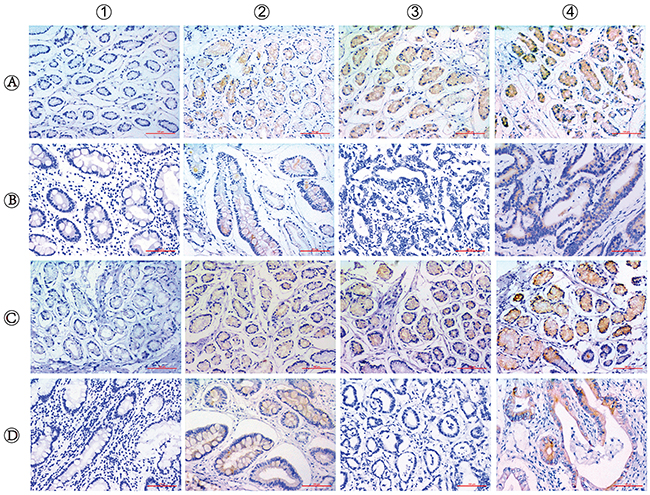 ERCC6 and ERCC8 staining were mainly located in the cell membrane and cytoplasm. Staining results were evaluated independently by two pathologists blinded to the clinicopathological characteristics of patients. ERCC6 and ERCC8 expression were scored using a semi-quantitative method that took into account both the staining intensity and the percentage of cells at that intensity [41]. For each sample, staining intensity was scored according to intensity (0, no staining; 1, mild staining; 2, moderate staining; 3, strong staining) and range (0, ≤5%; 1, 5%–25%; 2, 25%–50%; 3, 50%–75%; 4, ≥75%) of the staining. Finally, the staining intensity and the staining range were multiplied to generate an immunoreactivity score (IS) for each sample, which was divided as: no staining, 0; mild staining, 1–4; moderate staining, 5–8; severe staining, 9–12. A score of 0 meant negative expression, while all others indicated ranges of positive expression.