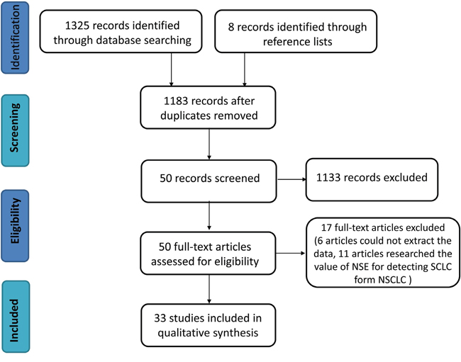 As showed in Figure 1, 1325 literature citations were identified from database searches, and 8 citations were identified from reference lists. Ultimately, 33 studies [8-10, 12-41] met the inclusion criteria and were included in our review. Among the 9546 samples studied, 2990 were diagnosed as SCLC.