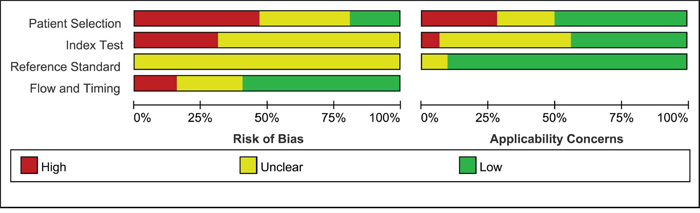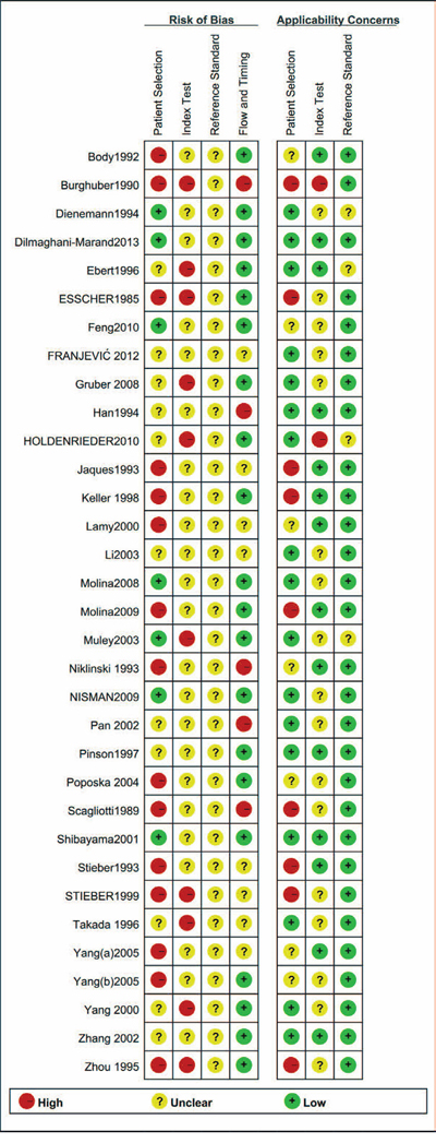 Study features (last name of the first author, year of publication, and country), number of samples and outcome data (TP, FP, FN, and TN) were extracted by two reviewers. The methodological quality of the included studies was assessed using the QUADAS-2 tool and Review Manager 5.3 (The Nordic Cochrane Centre, The Cochrane Collaboration, 2014). With respect to the Cochrane guidelines, we assigned low, high, or unclear risk of bias values to the patient selection; index tests, reference standards, and item flow and timing domains were also evaluated. Applicability concerns were evaluated in the first three domains.