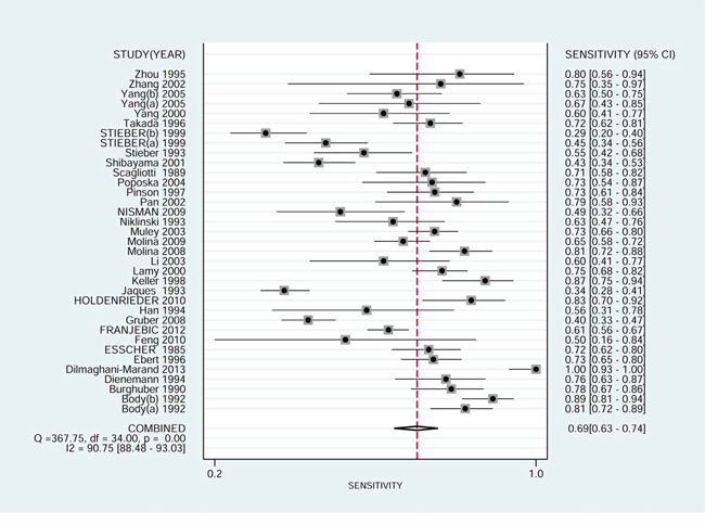 All studies were published between 1985 and 2013, Body et al. [14] and STIEBER et al. [25] each had two different NSE cut-off levels for detecting SCLC. Nineteen studies were from Europe, and 14 were form Asia. The NSE cut-off levels reported in those studies ranged from 7.5 ng/ml to 35 ng/ml. No NSE cut-off level was reported in two studies [40, 41]. Three different methods were used to detect NSE: ELISA was available in 15 trials with 3498 samples; 14 trials with 3838 samples used RIA; and 6 trials with 2210 samples used ECISA. The characteristics of the included studies are shown in Table 1.