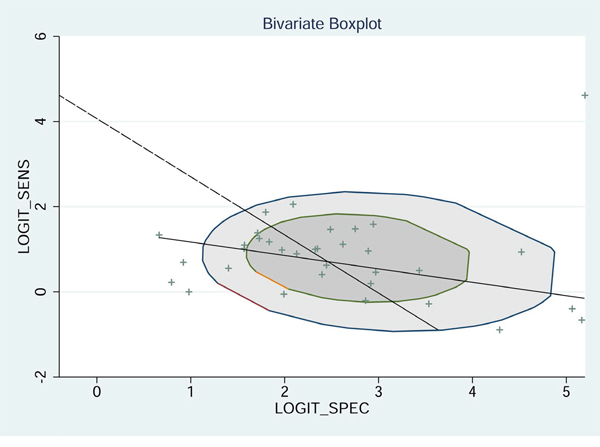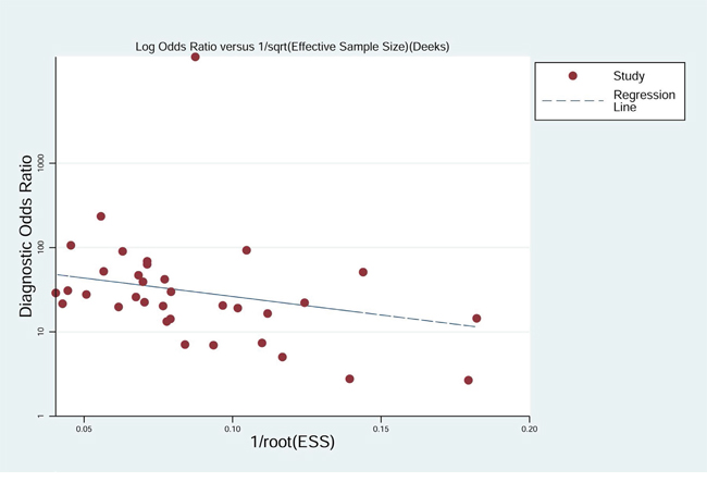 To assess the publication bias for the diagnostic tests, we used Deek’s funnel plots of lnDOR against 1/ESS1/2 or, equivalently, against (1/n1 + 1/n2)1/2, which is proportional to 1/ESS1/2 [42]. The p value obtained from the funnel plot was 0.001, indicating the presence of publication bias in this meta-analysis (Figure 10).