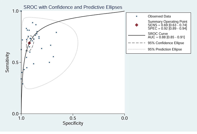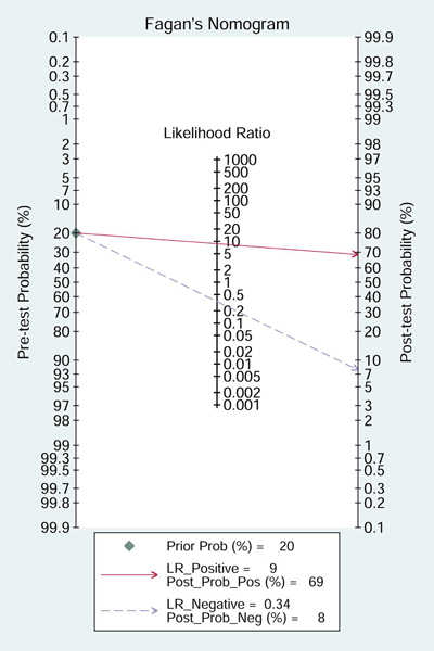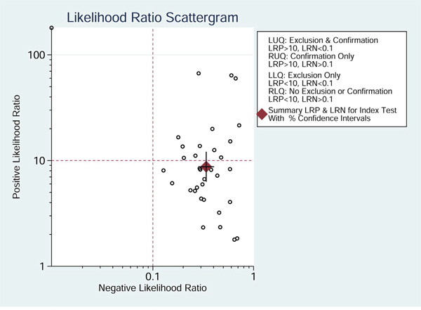 Pooled sensitivity, specificity, PLR, NLR, DOR, and AUC and associated 95% confidence intervals (CIs) were calculated using a bivariate regression model. Heterogeneity was assessed using a bivariate boxplot, Chi-square test, and inconsistency index (I2). If I2 was greater than 50%, significant heterogeneity would be considered to exist in the studies. In addition, meta-regression and subgroup analyses were used to investigate potential sources of heterogeneity. A likelihood ratio scattergram was used to evaluate the exclusion and confirmation capacities of the index test. Finally, clinical utility and publication bias were assessed using a Fagan diagram and Deek’s plot. The statistical analysis was conducted using STATA version 12.0 (Stata Crop, college Station, TX).
