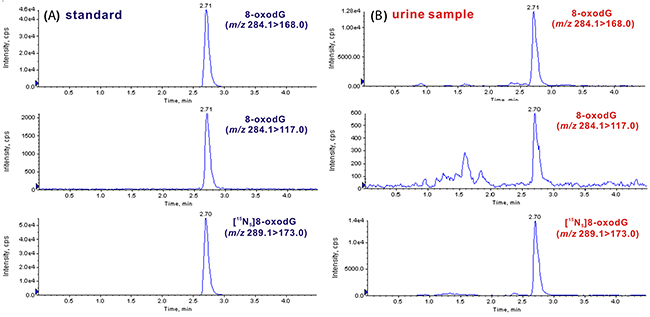Figure 2: Identification of 8-oxodG in urine sample by UPLC-MS/MS. (A) Representative chromatograms of 8-oxodG standard (m/z 284.1>168.0 for quantitation and m/z 284.1>117.0 for confirmation) and [15N5]8-oxodG internal standard (m/z 289.1>173.0). (B) Representative chromatograms of 8-oxodG and internal standard from human urine.