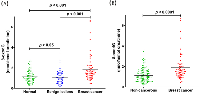 Figure 3: Quantification and statistical analysis of 8-oxodG in human urine samples. (A) 8-oxodG levels in healthy control group, patients with benign breast disease group and patients with breast cancer group. (B) 8-oxodG levels in non-cancerous group and patients with breast cancer group.