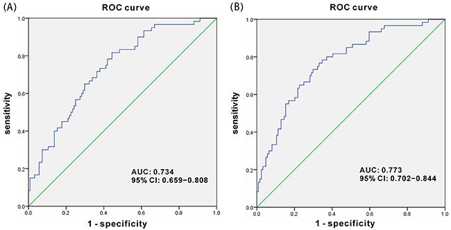 Figure 4: ROC curve for urinary 8-oxodG score. (A) Logistic regression model only concerning urinary 8-oxodG concentration. (B) Logistic regression model concerning urinary 8-oxodG concentration and age.