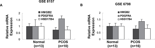 Figure 2: Genes involved in development of primary male sex characteristics. The expression of HMGB2, PDGFRA and HSD17B4 in insulin-resistant obese PCOS women and their age- and body mass index- matched controls in two different GEO datasets were demonstrated. (p values were calculated by unpaired two-tailed t-test, error bars represent mean ± SEM).