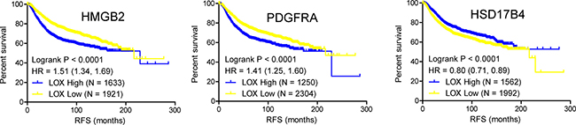 Figure 3: Kaplan-Meier plot of the relapse free survival of 3554 breast cancer patients based on HMGB2, PDGFRA and HSD17B4, respectively. (p value was calculated by Logrank test, significance was defined as p < 0.05).