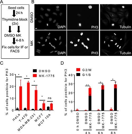 Figure 1: Inhibition of Wee1 kinase promotes premature entry into mitosis. HeLa cells were released from G1/S phase into media containing either DMSO or MK-1775 (MK) and then fixed at indicated times. (A) Experimental flow chart depicting treatments and times. (B) Cells were stained for DNA, PH3, and microtubules and then analyzed by immunofluorescence microscopy 4 h post treatment. Scale bar = 10 μm. (C) Indicated cell lines were treated with DMSO or MK-1775 for 4 h and then analyzed by immunofluorescence microscopy for PH3 and DNA. Percent total cells positive for PH3 is shown. Student t-test was used to determine significance between DMSO and MK-1775 (*p < 0.05). (D) Cells stained for PH3 and DNA were analyzed by FACS to determined cell cycle phase. Average percentage of cells positive for PH3 relative to DNA staining are shown. Error bars are standard error of the mean. Black bars represent cells in the G1/S phase and red bars represent cells in the G2/M phase. Statistical significance was determined by student t-test (*p < 0.05 and **p < 0.005